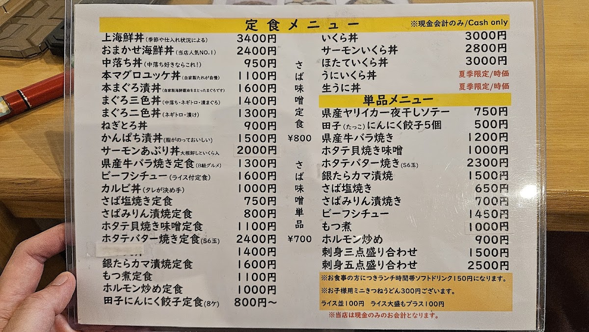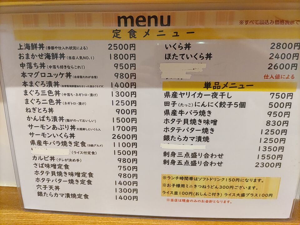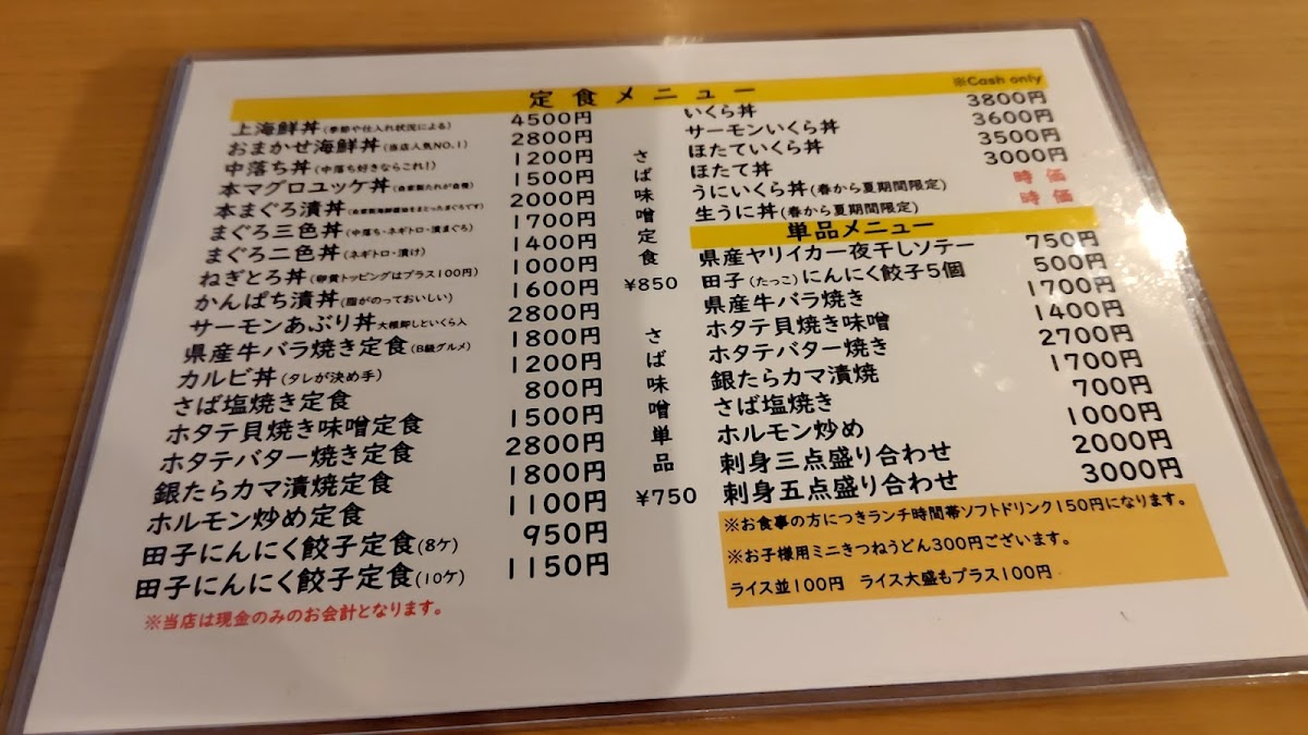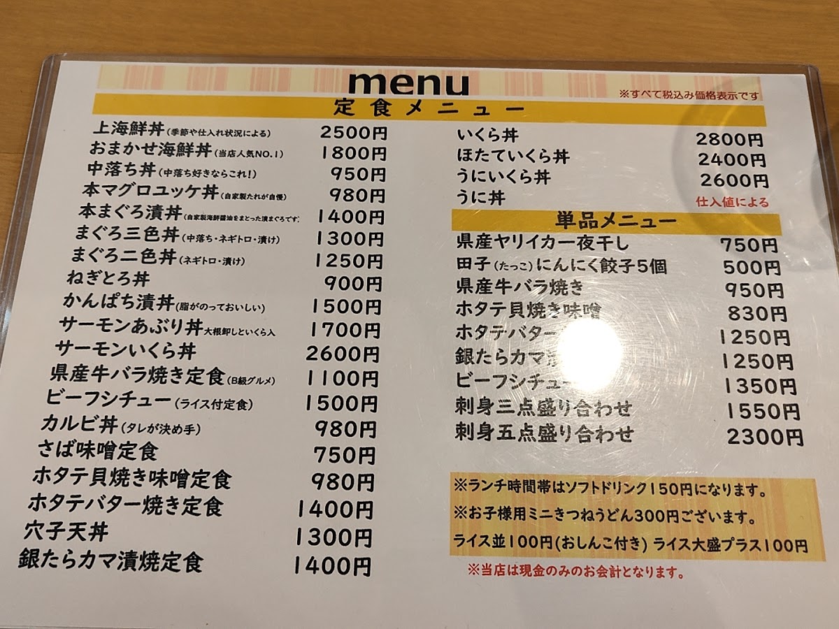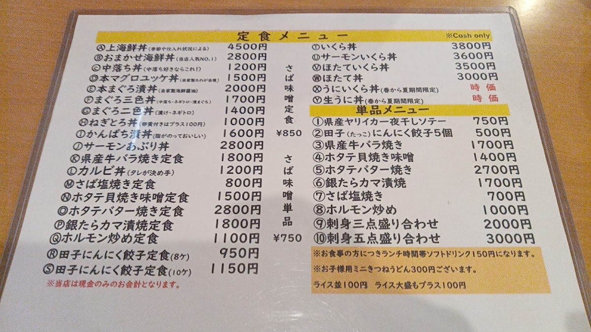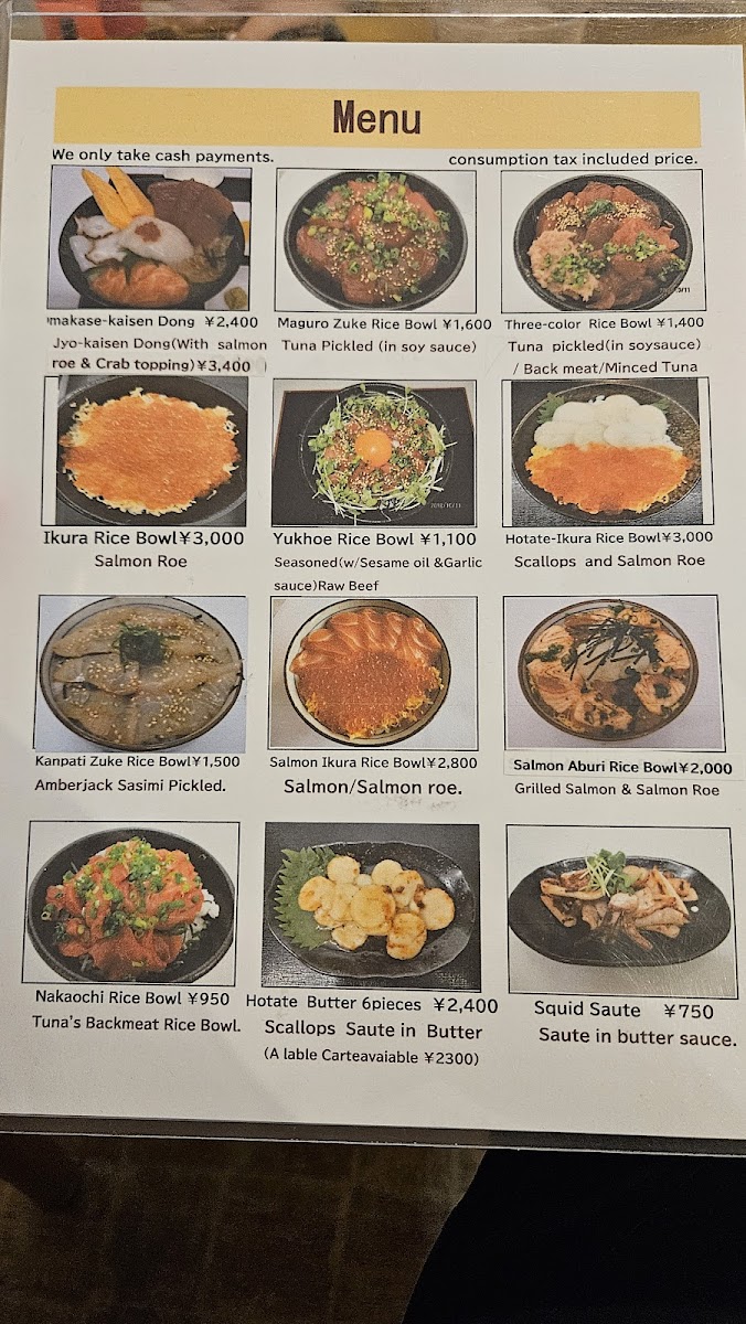 Aomori Kitchen Pope offers a menu that is a true celebration of Aomori’s rich seafood and local flavors, delivering both freshness and artistry in every dish. The おまかせ海鮮丼 stands out with its vibrant assortment of seasonal fish, perfectly balanced over warm rice, while the 本マグロユッケ丼 showcases melt-in-your-mouth tuna seasoned just right to highlight its natural richness. The ホタテバター醤油焼き定食 impresses with plump scallops seared in butter and soy, pairing beautifully with a comforting set of sides. For uni lovers, the うに丼 is an indulgent choice, featuring creamy sea urchin that exemplifies the ocean’s freshness. Meat options shine as well, with the 青森 県 産 牛 バラ 焼き 定食 offering tender, savory slices of local beef that are grilled to perfection. Other donburi options, such as the 中落ち丼, bring bold flavors with generous cuts of tuna, while the イクラ丼のイクラ dazzles with glistening salmon roe that bursts with briny sweetness. The かんぱち漬け丼 completes the seafood selection with lightly marinated amberjack, allowing the fish’s natural flavor to shine. Overall, the menu at Aomori Kitchen Pope is a carefully curated showcase of regional ingredients, combining traditional techniques with thoughtful presentation, making each dish both satisfying and memorable.